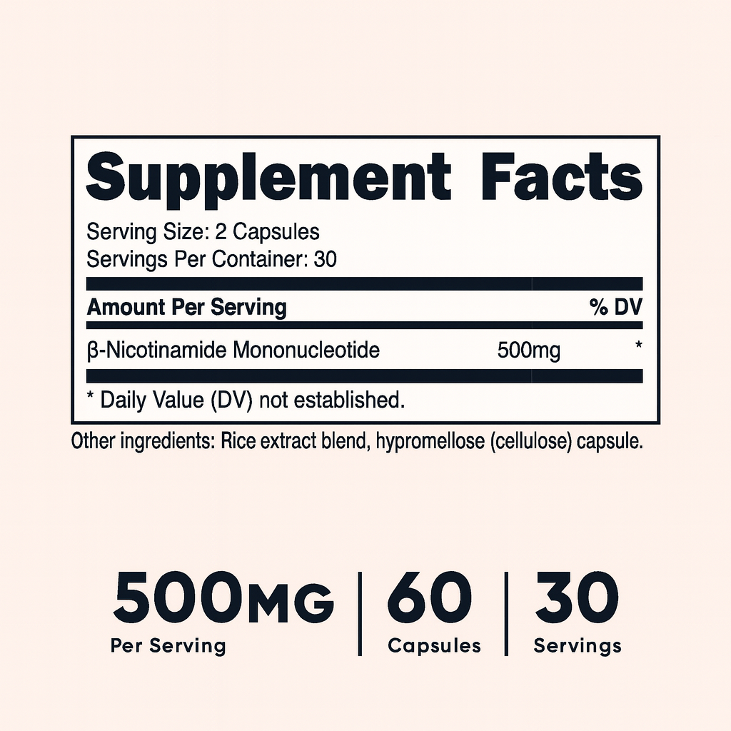 - 500mg of NMN (Nicotinamide Mononucleotide) Per Serving